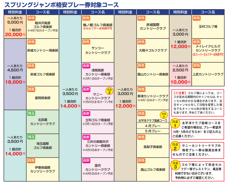 対象となる群馬県・栃木県・埼玉県のゴルフ場の各コース別「格安!特別優待価格」をどうぞご覧ください。